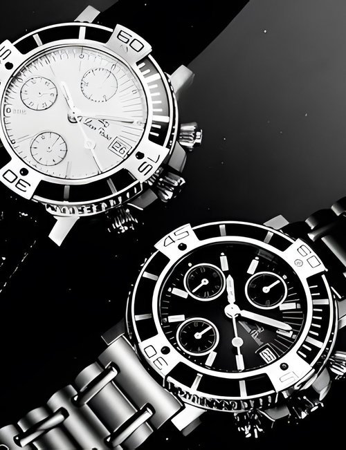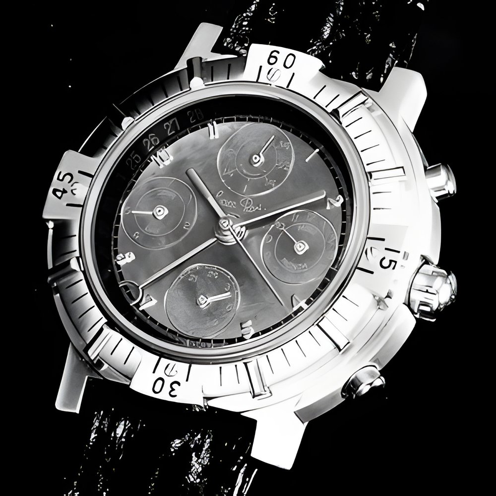 This model’s sporty looks and luxury finish enclose a high-frequency (28,800 v.p.h.) selfwinding movement. This is the new version (scaled-down diameter: 37 or 35 mm) of Lucien Rochat’s “Royal Air Or” design. It features four indicators moon phases, second timezone with 24-hour display, day of the week and month. A centrally positioned pointer shows the date. The case and one-way rotating bezel are in 18K gold. Sapphire crystal, mother-of-pearl dial, 18K gold bracelet or leather strap.