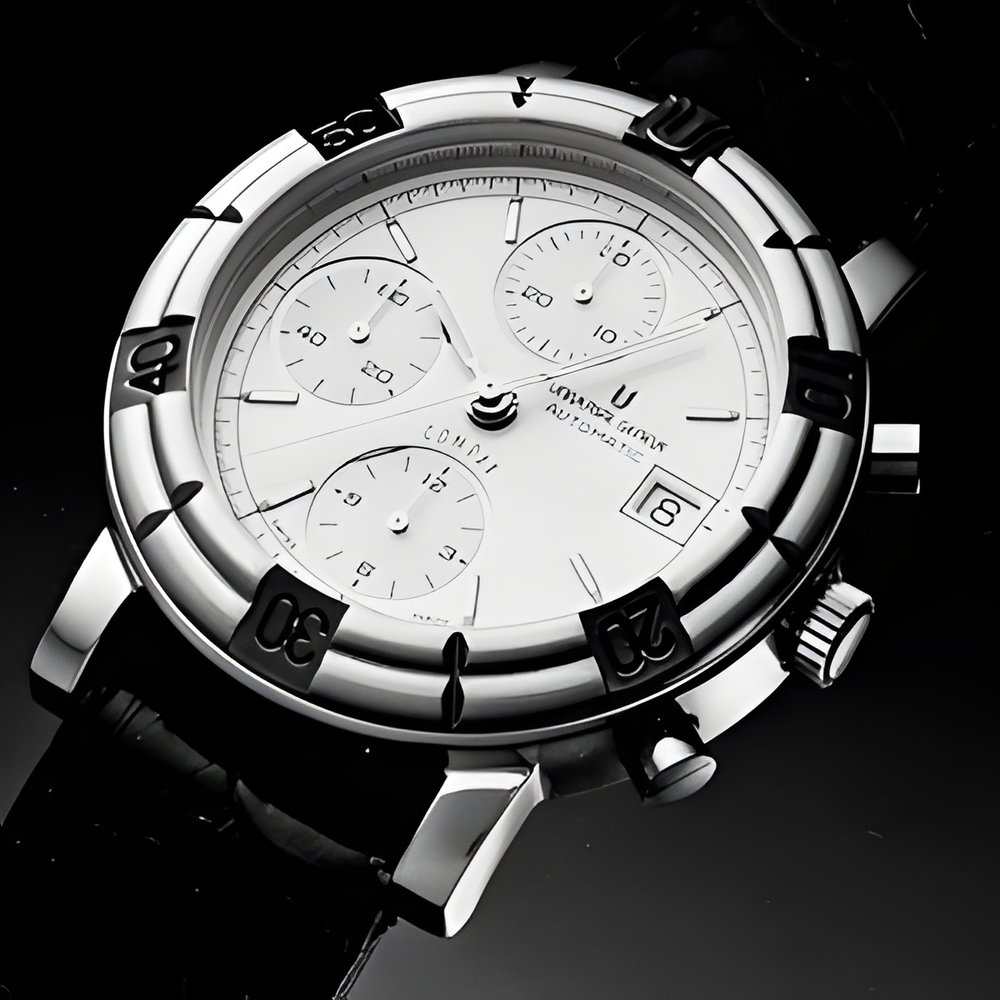 The diver’s version of Universal Genve’s “Compax” is water-resistant to 10 atm (100 m). Screwed-in case back, screw-lock crown and rotating bezel; even the alligator strap is water-repellent. Meticulously finished selfwinding Vaijoux 7750 movement with three totalizers and date calendar at 3 o’clock. Steel two-tone styling with outcurved mineral crystal. (UNIVERSAL GENEVE)