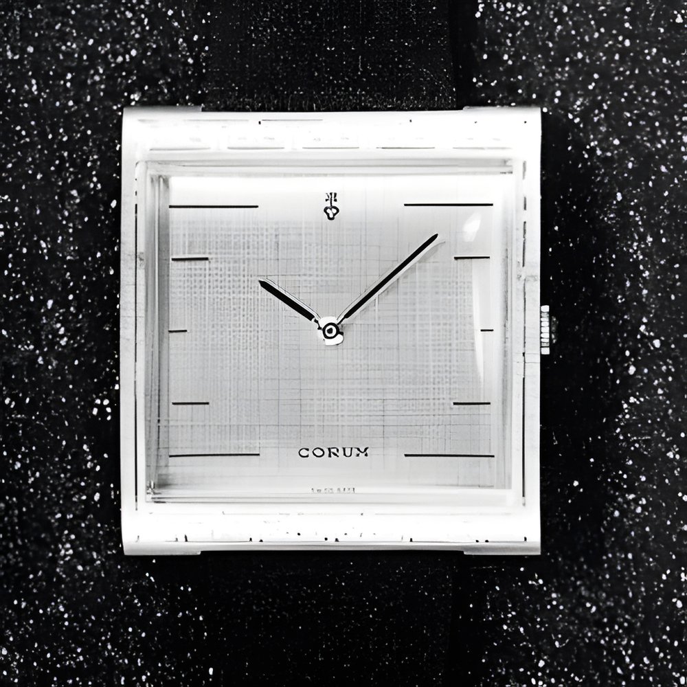 Swiss styling in the grand manner for this man’ s watch whose dimensions are on generous lines Its solid gold case alone weighs 40 grammes Extra touch of luxury : the crown also in gold has a sapphire bush. Note the distinctive dial treatment. (CORUM “Buckingham”)