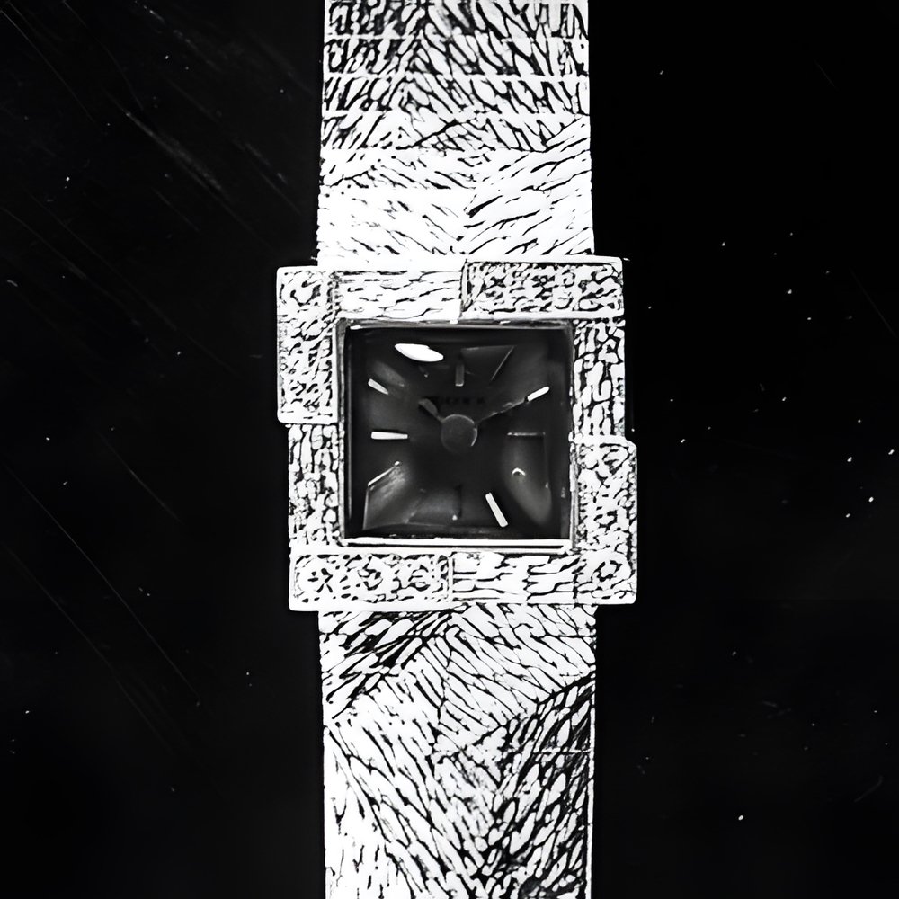 High fashion watch in grey gold with attractive diamond treatment Around the square bezel, four layers of three stones are set in an overlapping style, ving the piece