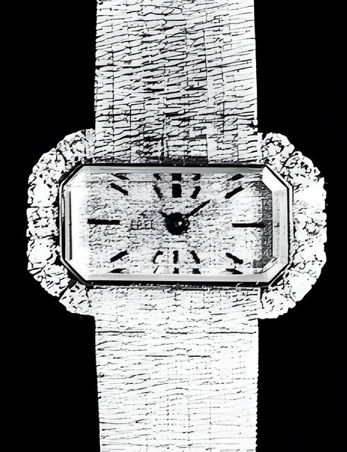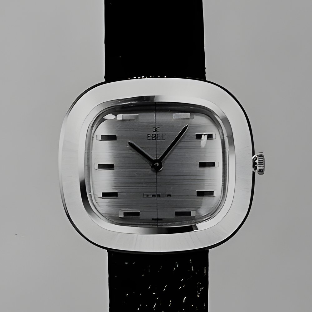 The round and the square are happily combined in the unusual styling of this man’s watch. The finely chiselled large bezel incorporates a polished bevel and the dial is starkly simple arid modern with horizontal markers In 18 ct. gold. (EBEL “Brasilia”)