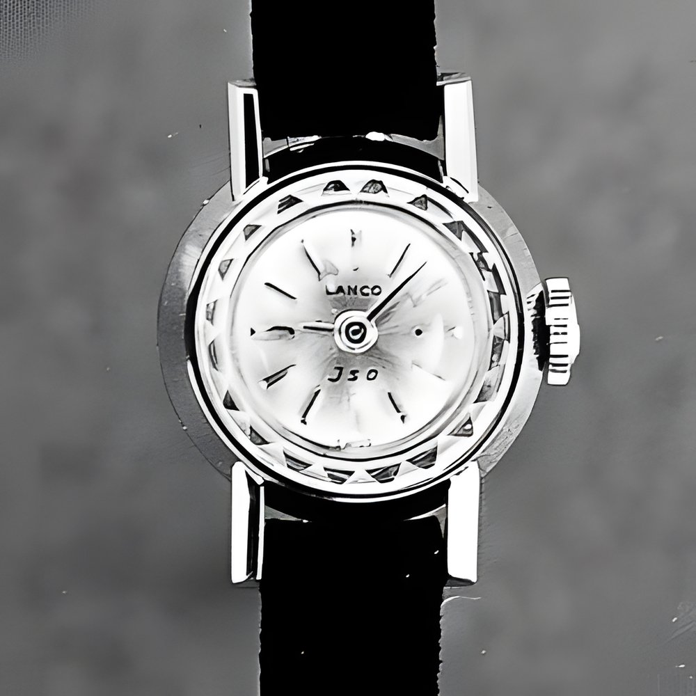 This ravishing new woman ’ s watch scores points both for styling and a wide number of outstanding technical features. It is fitted with a new extra flat Lanco 6 " 600 caliber, without seconds, and the following dimensions : diameter 15.55 mm ; height 2.90 mm ; auto-lubricating spring, 45 hour power reserve ; balance vibrations/hour 21 ,600 ; diameter of balance 6.70 mme. (LANCO)