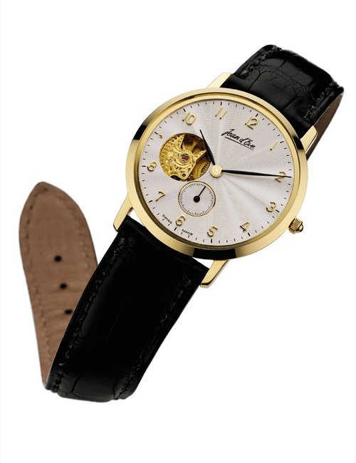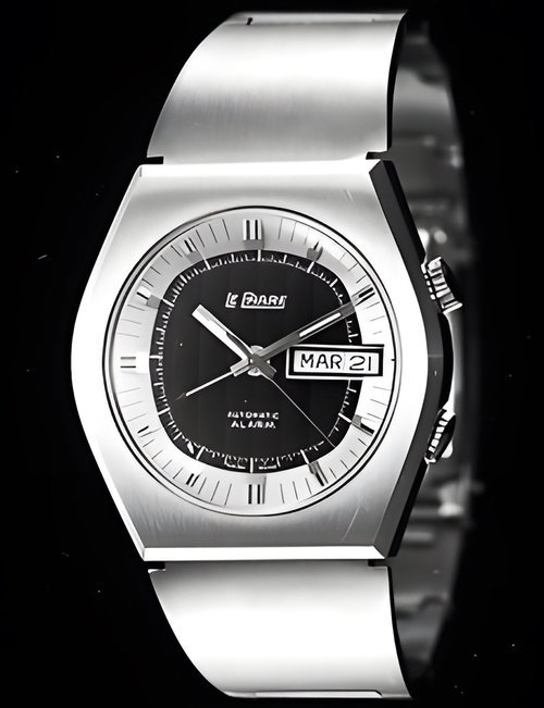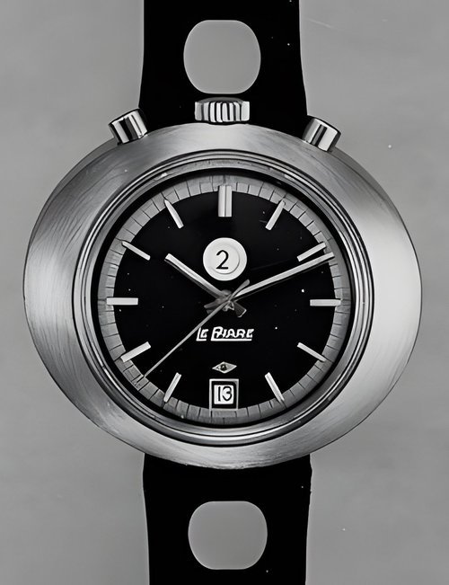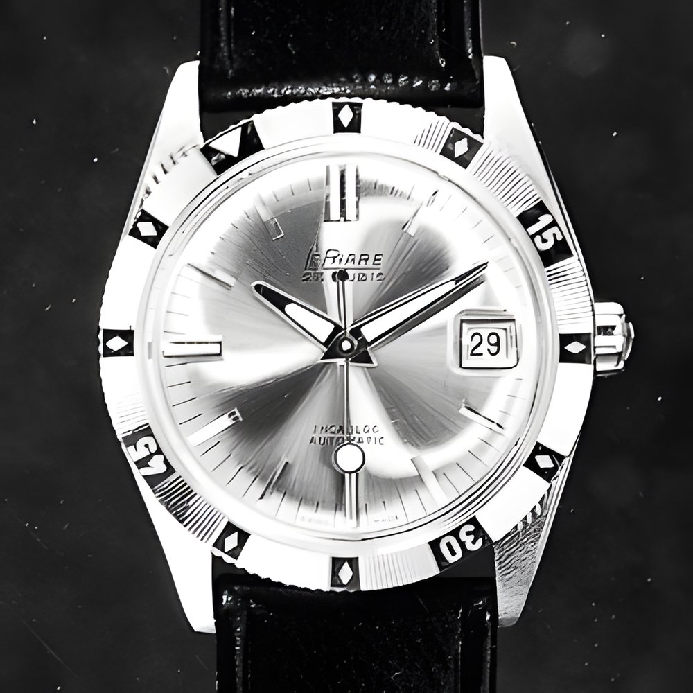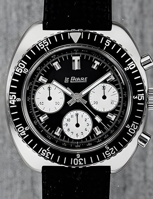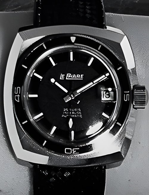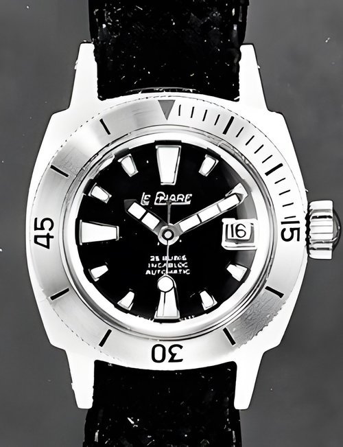 A diver’ s watchall dressed up for the evening. This stylish newcomer is guaranteed waterproof to 120 feet and is powered by an automatic movement 11 - ETA 2472 with date calendar which changes on the stroke of midnight. It is entirely in 18 ct. gold, including the turning outer bezel, Dial comes with either applied markers or ìncrusted radium. (LE PHARE)