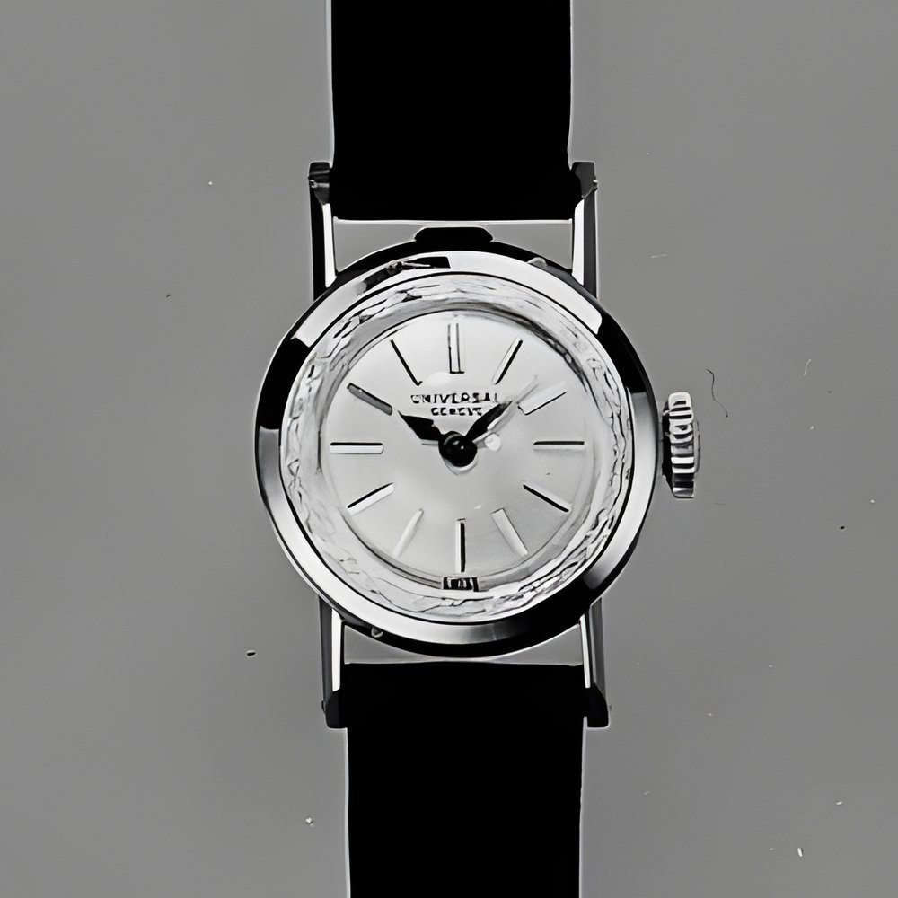 Total diameter of this woman’s watch is less than 18 mm. None the less, it is powered by a fully automatic movement. In addition despite its extremely low height, it is waterproof (with a tension ring). This type of specification has been obtained by use of a new automatic caliber 650 with annular balance (199800 vibrations per hour). The movement can also be fitted with a centre second hand and later, with a date calendar. (UNIVERSAL)