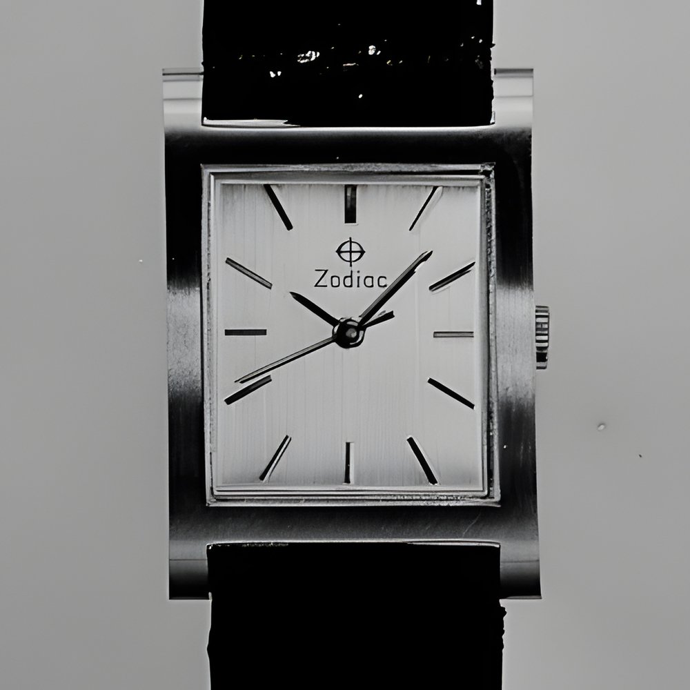 Sober, rectangular styling typify the 1964 Swiss watch line in this classic men’ s watch in all-steel. The model known as the "Soa Wolf Il has a sweep-second hand - rare in a watch of this type. (ZODIAC)