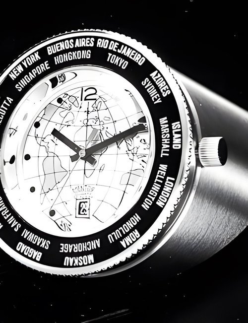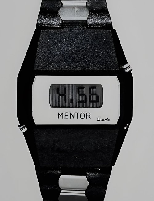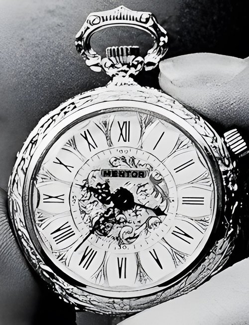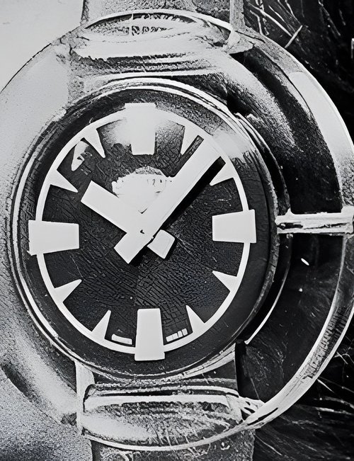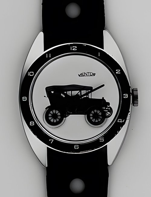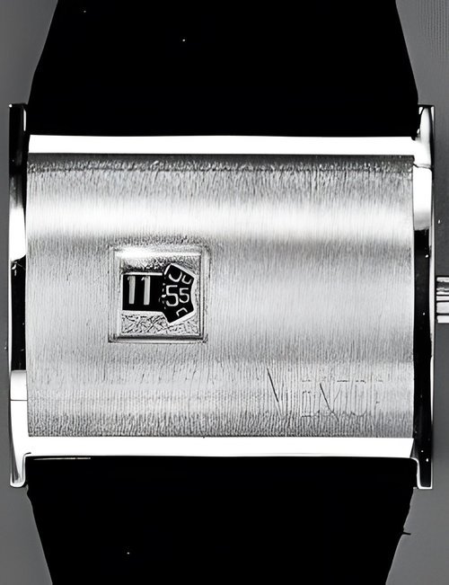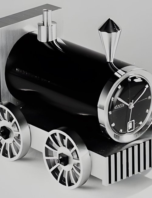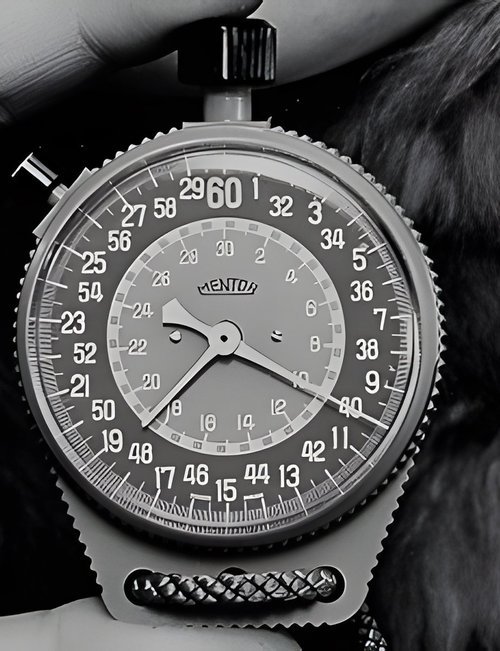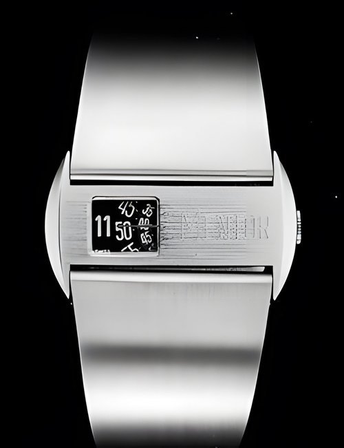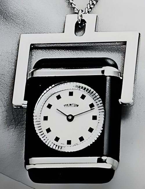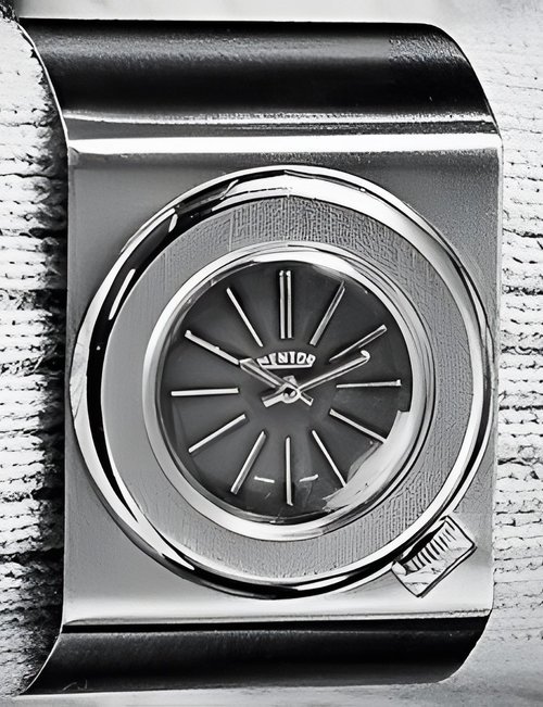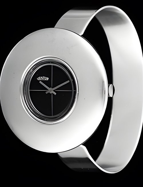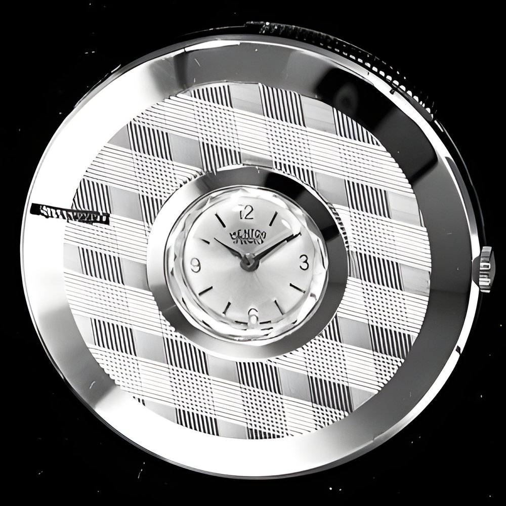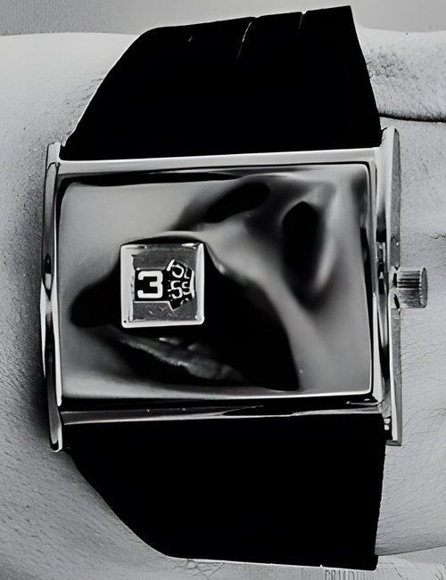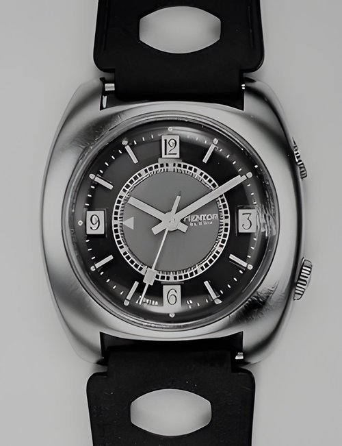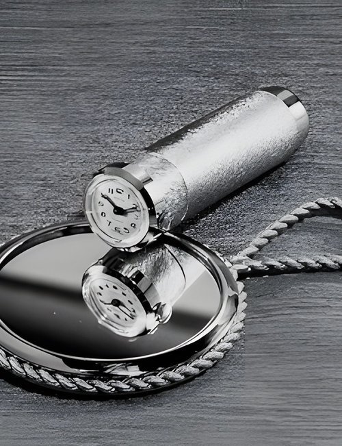 A cigarette lighter plus a watch. Inside, a plastic shell for the lighter fluid. The rounded case is agreeable to handle and, something even more important, does not damage pockets. Case in extremely light aluminium. (BADER “Mentor”)