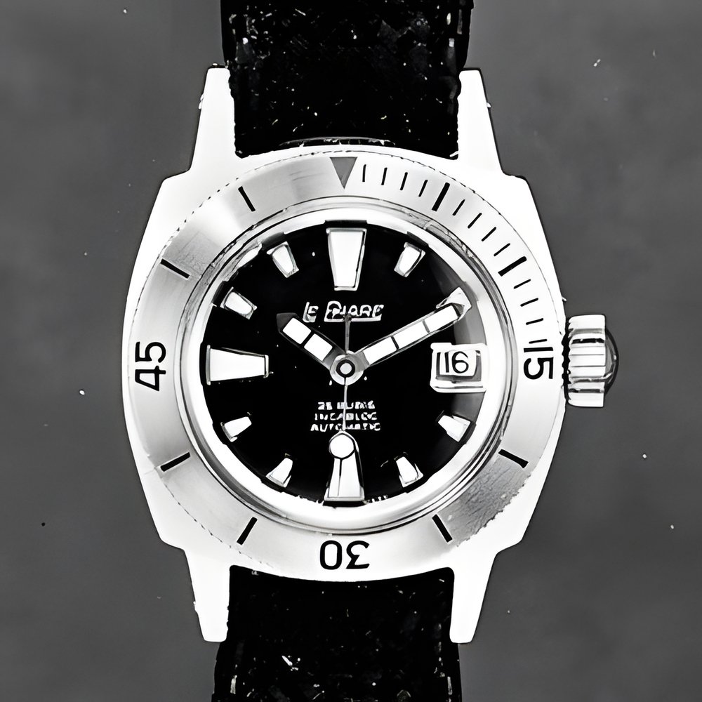 The ideal watch for the sports-minded woman. Automatic, shock-protected, waterproof down to 10 atmospheres (meaning to a depth of 300 ft), it is supplied with a calendar and movable bezel (far diving calculations). In addition, its cambered square shape is in the latest fashion. (LE PHARE)