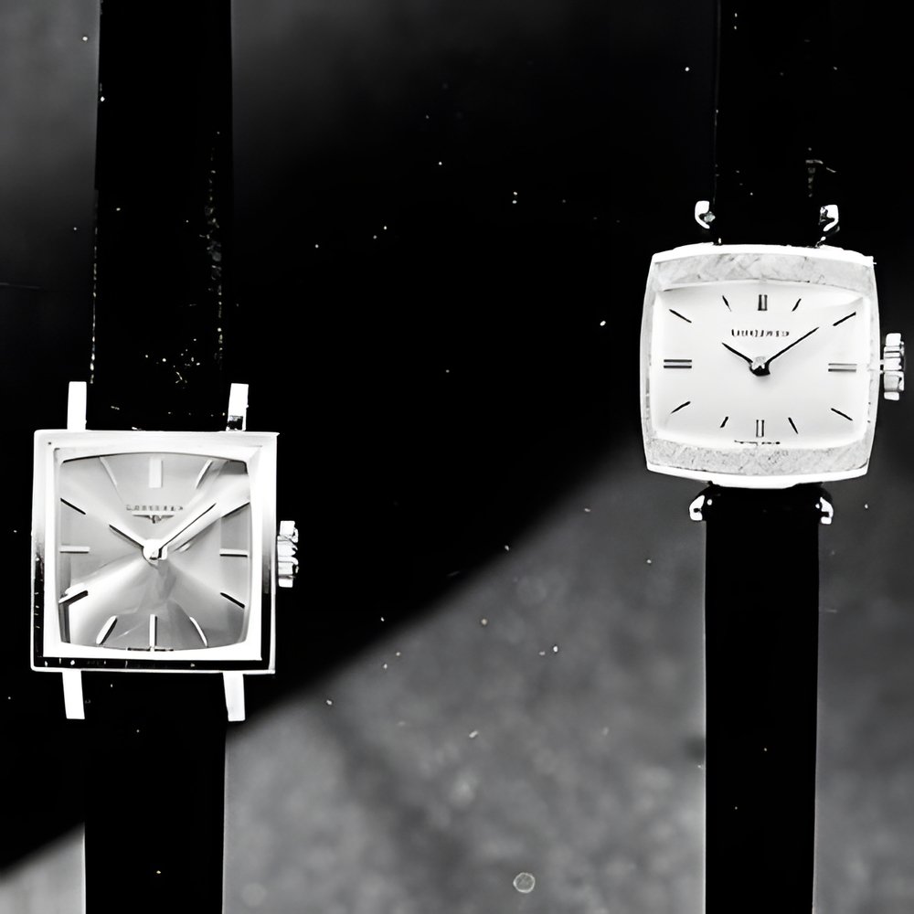 Two of the latest models for ladies by Longines , perfectly illustrating the new “soft look”. While the watch on the right shows the cambered square shape clearly, the one at left employs this style in a more subtle way - for the dial opening,, Both models in 18 ct gold. (LONGINES)