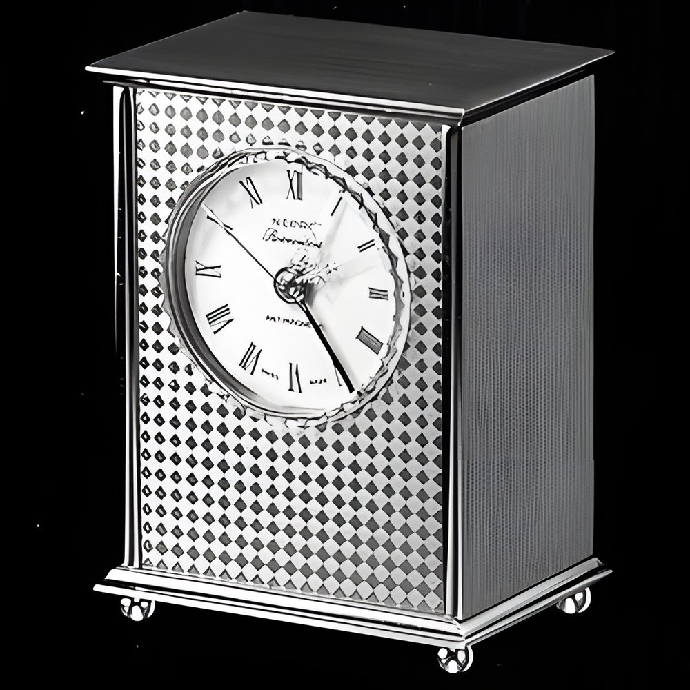 Unusual two-in-one power combination for this new small alarm clock. It has a normal hand-wound movement, but the alarm mechanism is electric and works from a 1 ,5 Volt battery, giving an extremely audible signal. Gilded case, chiselled on the outside face with a silvered dial and Roman numerals. Total height is 22 inches. (NEPRO “Rotocontact”)
