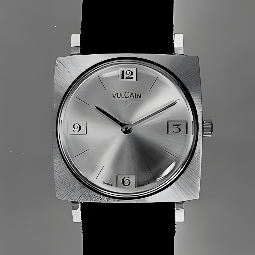 The “soft look” is aptly illustrated by this new Vulcain creation for men. The case is in 18 Ct gold, ant the sunburst dial has numbers engraved in tiny gold plates. Extraslim, without center seconds, (VULCAIN)
