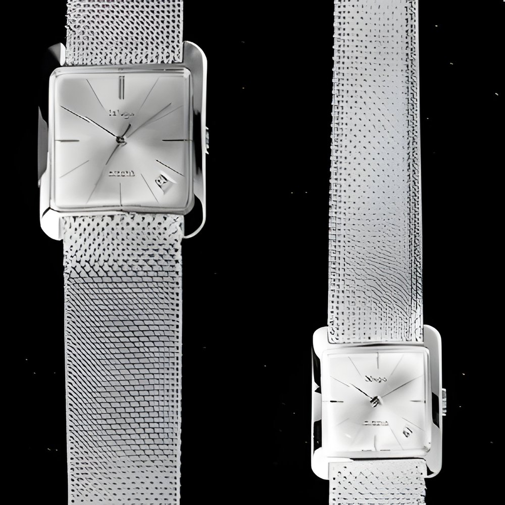 Size is the only difference between the ladies’ model and the one for men. The corners of these square-shaped cases are strongly rounded, in line with current fashion. Date window in the lower right corner. Available in rhodium or goldplate. Fitted metal band. (WEGA)