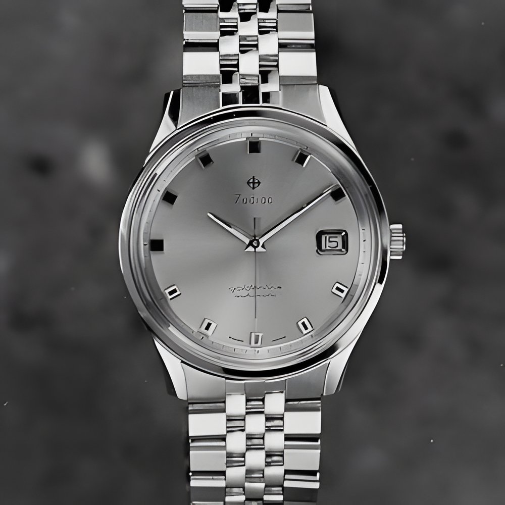 An entirely new model from Zodiac, called appropriately t?Goldenlinett. It is automatic and has the date calendar feature. Note the fine edged styling and the classical dial treatment in which the markers are enamel encrusted. Case in steel or goldplate (ZODIAC "Goldenline)