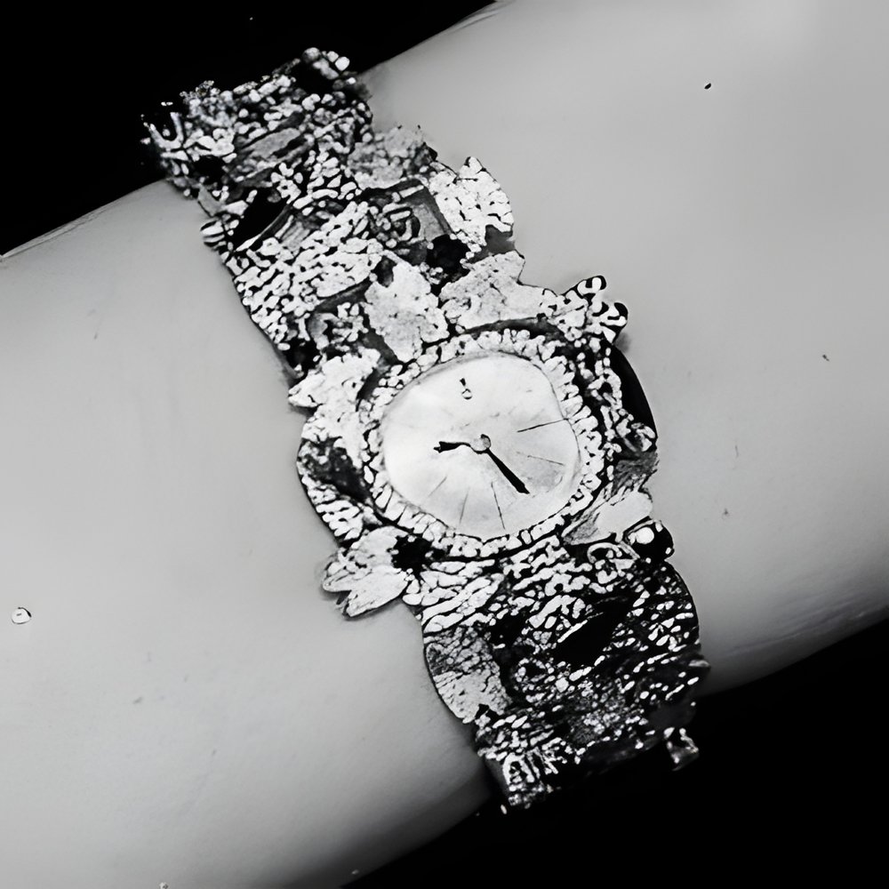 Colour and modernity are combined in this chunky bracelet watch which is unabashedly luxurious in concept. It follows the new trend of mixing other precious stones with the normally dominant diamond and has eight rubies (0.96 et.) and nine brilliants (0.76 ct.). The watch itself is in yellow gold and has a finely chiselled bezel. (CORUM)