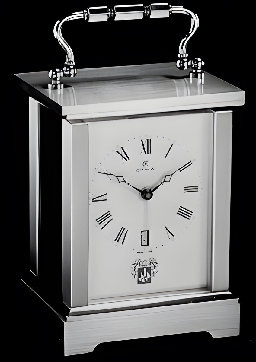 “Officer” type alarm clock in gilt metal. With electronic movement and calendar. 365 days’ power reserve for both movement and alarm mechanism. (CYMA “Officier”)