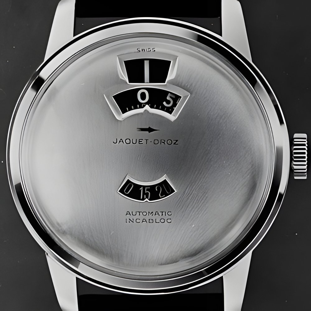 A fino example of the wido range of watches - over 1500 models in tì:iO Jaquot-Droz collection : this model doos away with hands. The hours, minutos and seconds appear in 3 distinct apertures. (JAQUET-DROZ)