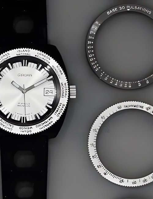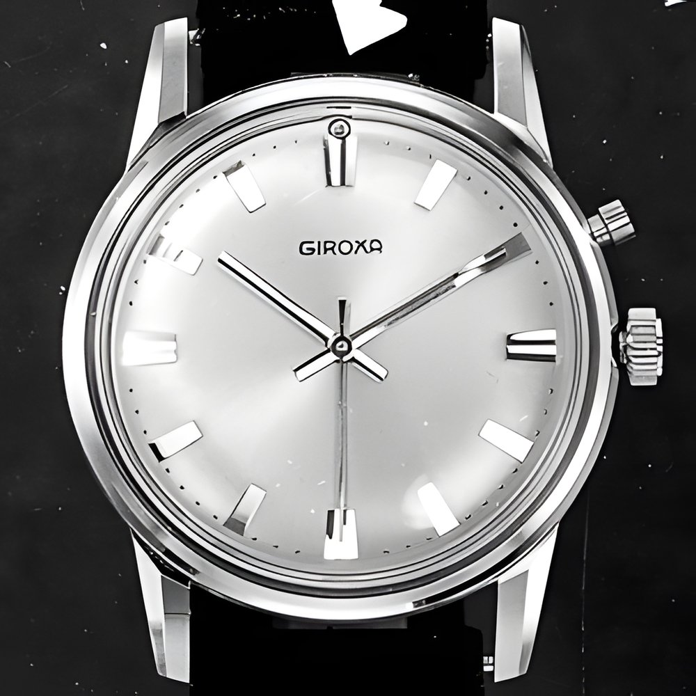 This wristwatch embodies an independent lighting system powered by a battery lodged in the case. A tiny lamp not only lights up the dial but can be used to read a map or find a keyhole, etc. A single pressure on the button, which can be maintained, snaps on the light. Allsteel, goidpiate or rhodium-like waterproof case. (GIROXA)
