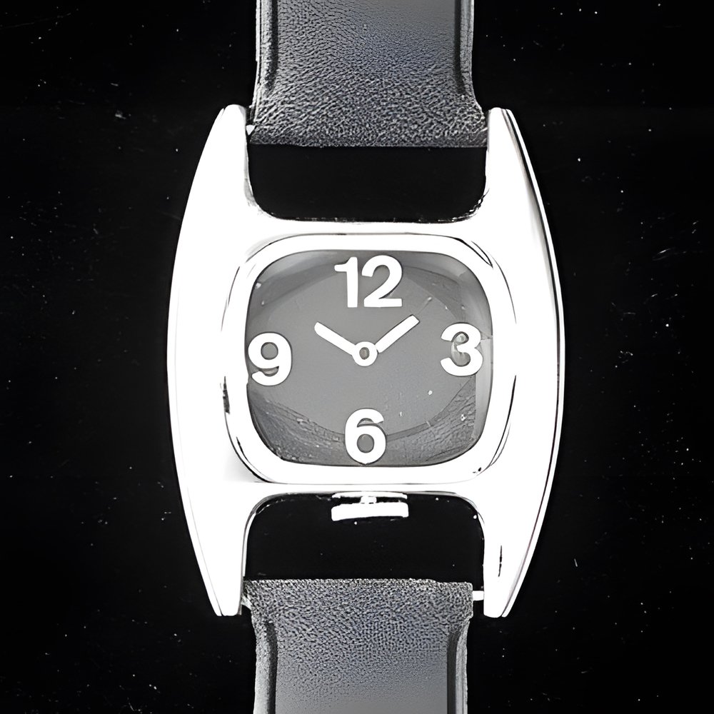 Ladies’ watch with very rounded linos and long lugs. The dial, blue on this model, is available in a variety of bright shades. (AMIDA)