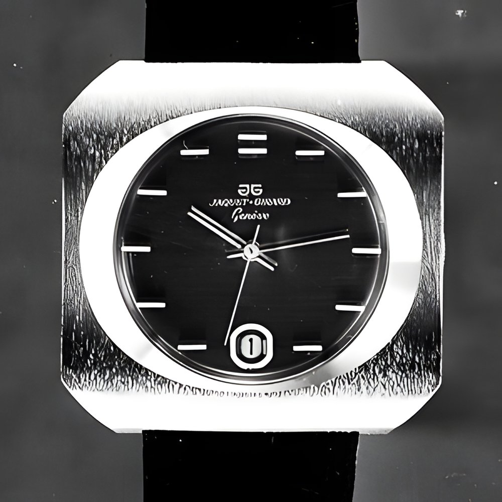Bold shapes for this new all-steel waterproof watch (to 5 atmospheres) with round dial set off by wide expanses of case front. Automatic or manuliy wound models. (JAQUET-GIRARD)