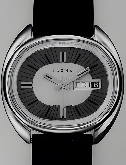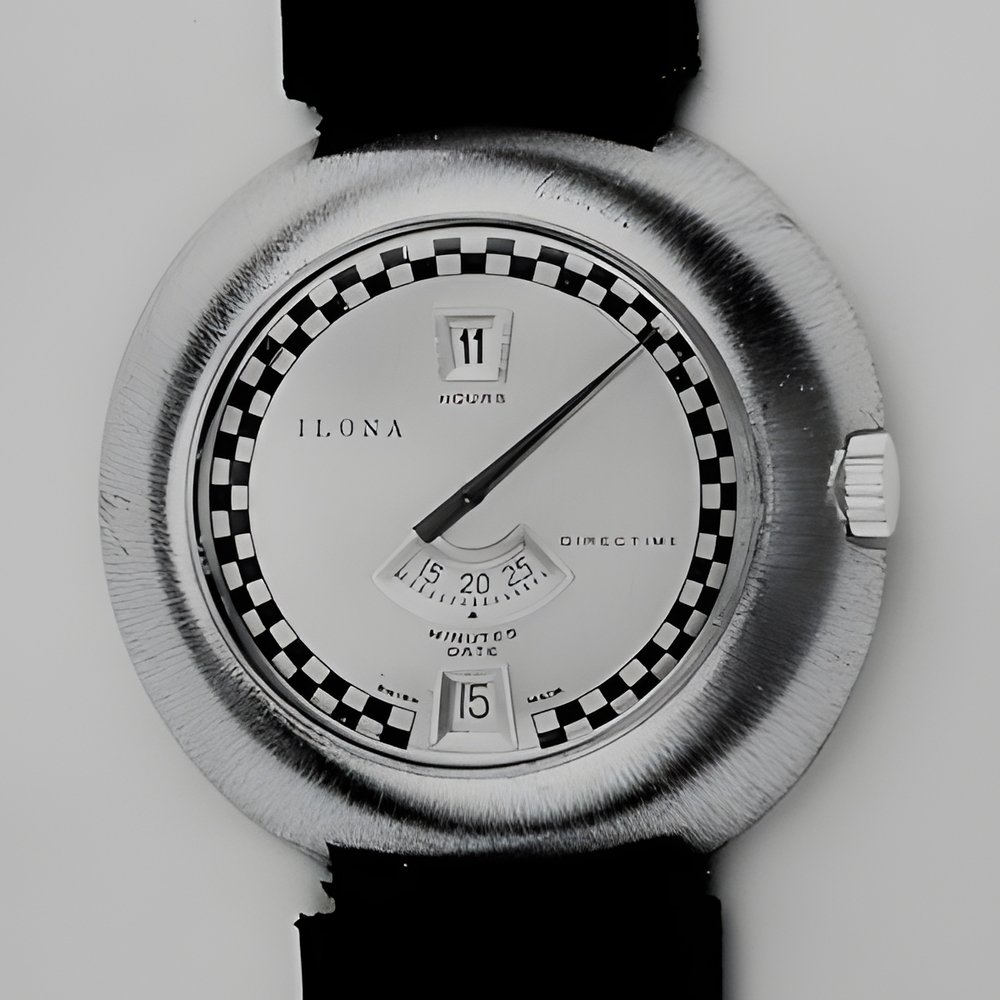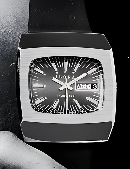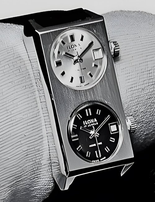Variety in the economical watch field here, a digital dial watch. The hours and the minutes are shown in separate apertures. Gilt or chromed case. With date. (ILONA)