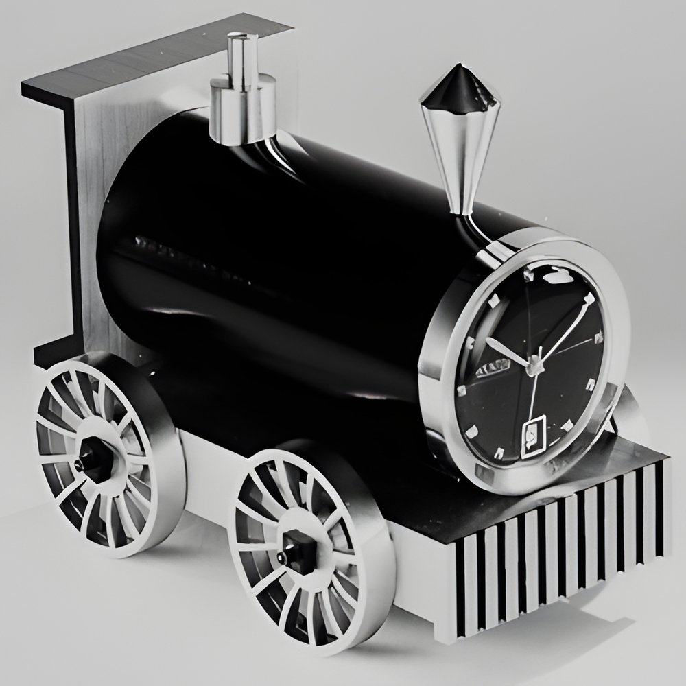 An amusing small clock. The watch is housed in the boiler of this toy locomotive. With date. Yet another example of the variety available in the economical watch field. (BADER)
