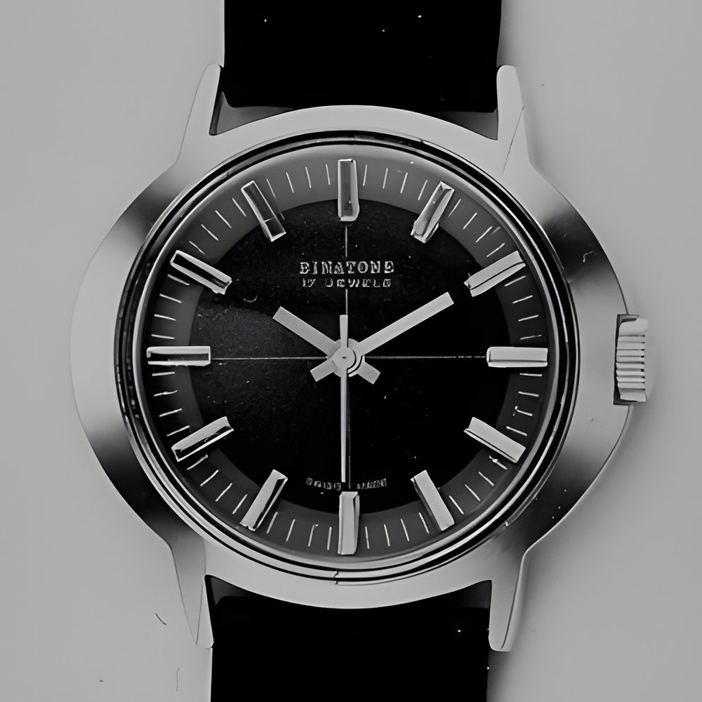 An economical watch with definite styling elegance. Oval, modern-line case, recessed crown and two-colour - blue and red - dished dial. (FEREX-Binatone)