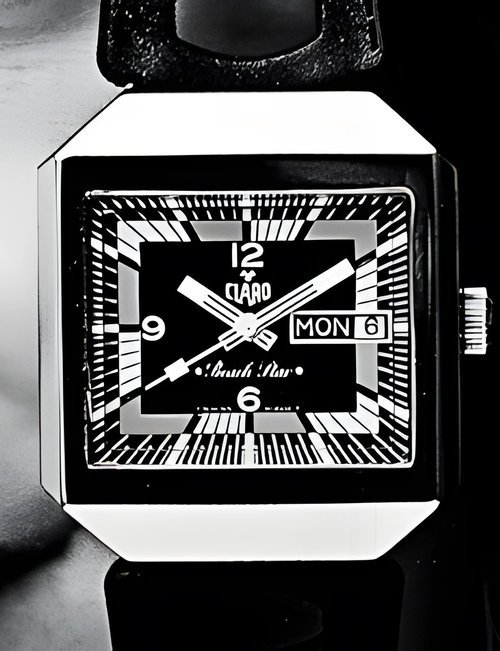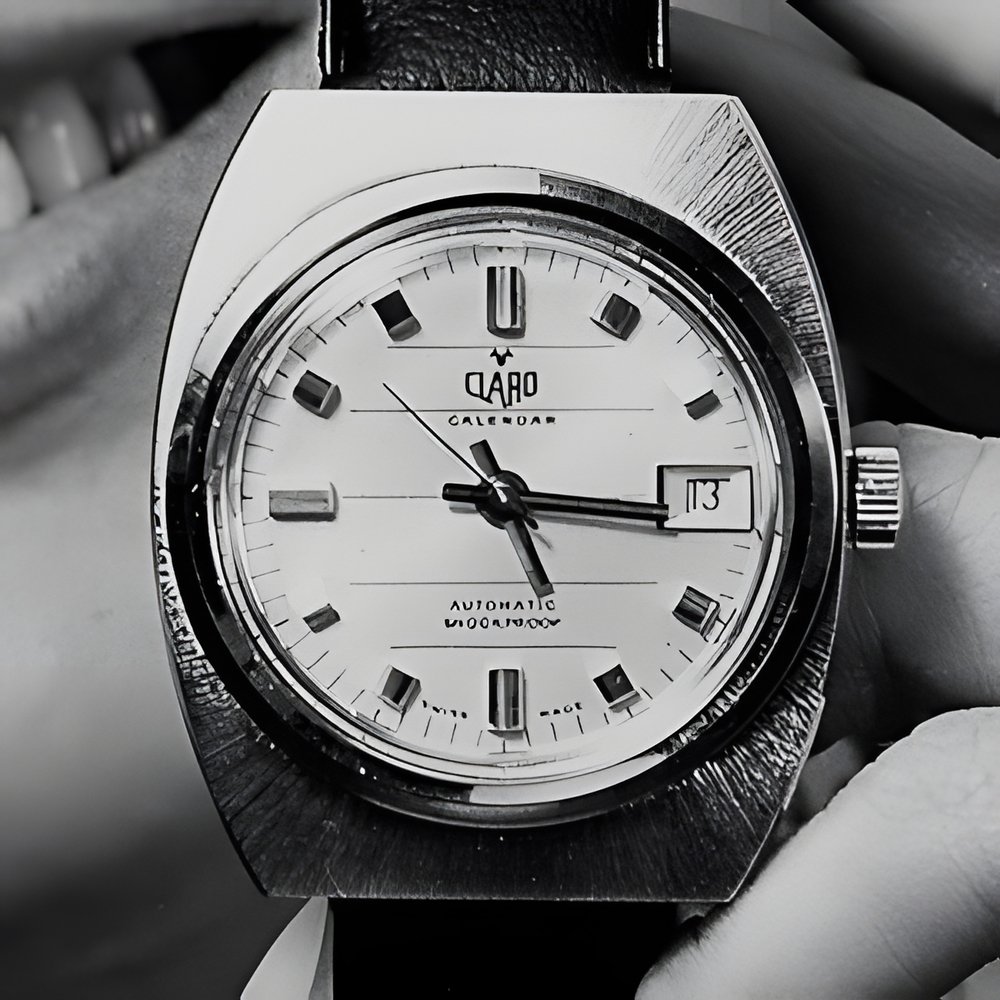 For men : a very modern watch with automatic movement. The bracelet flows into the tonneau-une gilt case. Dial with strongly raised hour-markers. This model is water-resistant, shockprotected and includes a calendar. (CLARO)