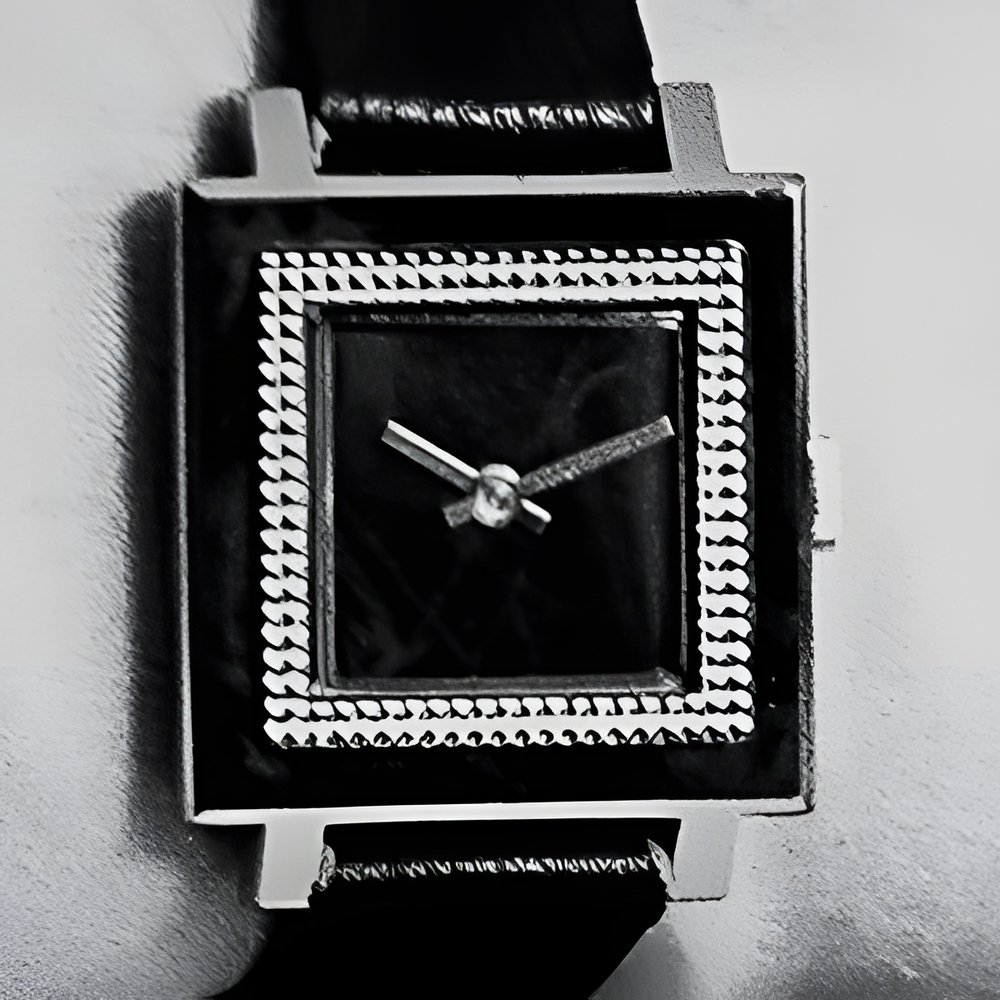 An afternoon watch with clean, sharp lines. The dial, without hour-markers, is marbled brown, a perfect imitation of precious stone. The same design is found on the bezel framing a large gilt dial. (FEREX)