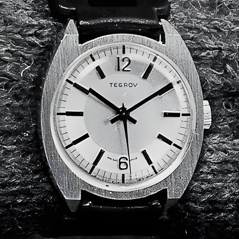 A man’s watch which is also at home on a feminine wrist. The black hour-markers stand out sharply against the gilt dial. Gilt case. (TEGROV)