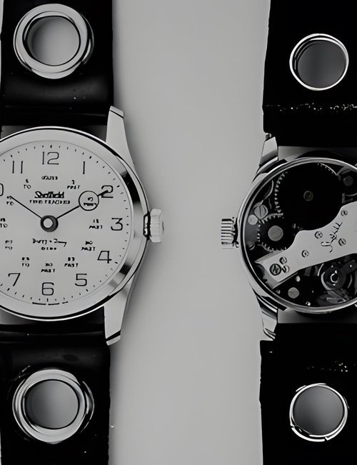 A new twist to watch wearing: the “belt-watch”. Worn very loosely over a long sweater or cardigan with the dial upside down. For reading the time, if problems arise, just ask your neighbour. The “watch” part can be separated and worn on the wrist. (SHEFFIELD)