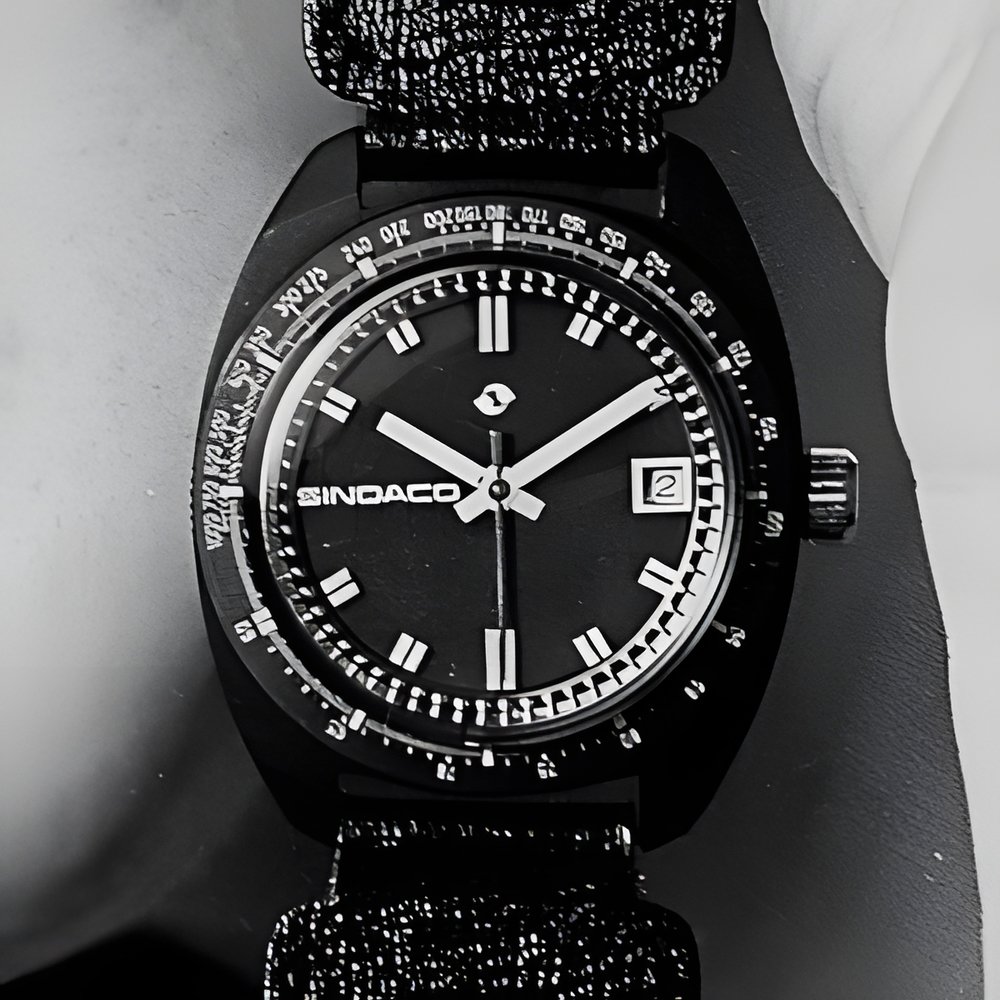 Here is a very light and pleasant to wear sports watch incorporating a new feature its case is oxidised aluminium. It was tested for colour durability at the Swiss Laboratory for Horological Research (LS1RH), Water-resistant, shock-protected, calendar, dial with large luminous hour-markers and turning bezel with tachymeter scale. (SINDACO)