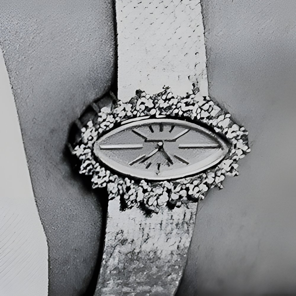 Dainty jewellery watch in 18 ot grey gold. The navette shaped case is placed across the bracelet. The case’s lines are underlined by a row of increasingly large diamonds. Note the fine texture of the wide, supple bracelet. (AUDEMARS PIGUET)