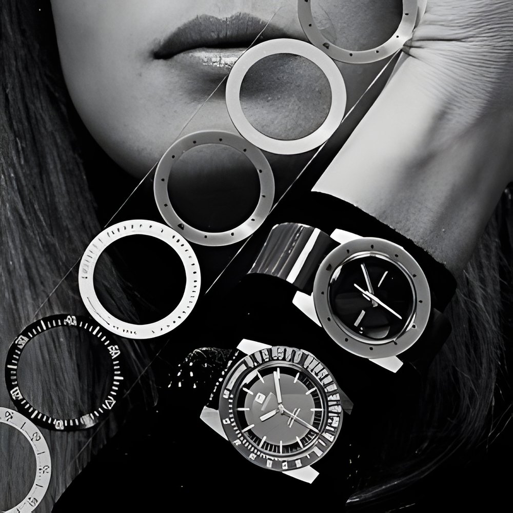 For mon or women, watches with a new design combining the two outstanding features of today’s fashion : colour and technique. Living up to its name, “Carrousel-” , this watch comes in two versions, Fashion : with dials of various colours, without numerals but with a choice of interchangeable coloured bezels. Technique : again a choice of dials, this time with a highly legible minutecircle and a series of “technical” bezels : universal time - decimal scale - pulsometer - memory aid. With or without automatic move ment, Goldplate or steel waterproof case. (TISSOT “Carrousel”)