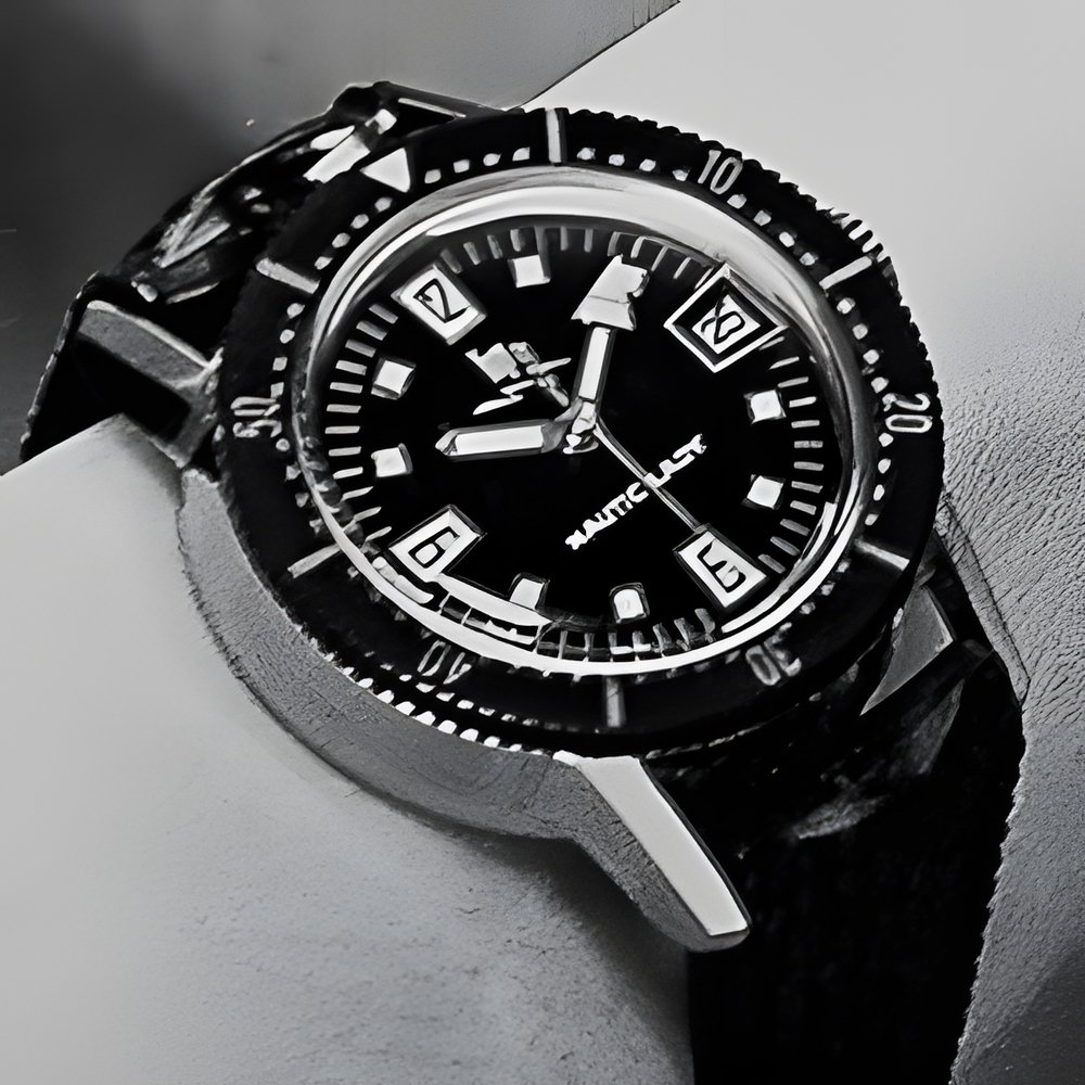 Ladies who take the plunge can now choose a diving watch with an electric movement. Its all-steel case is waterproof to 60 meters (2Ö0 feet) and it naturally boasts a turning bezel for elapsed time measurements. With calendar. (LIP “Nautic Ladys”)