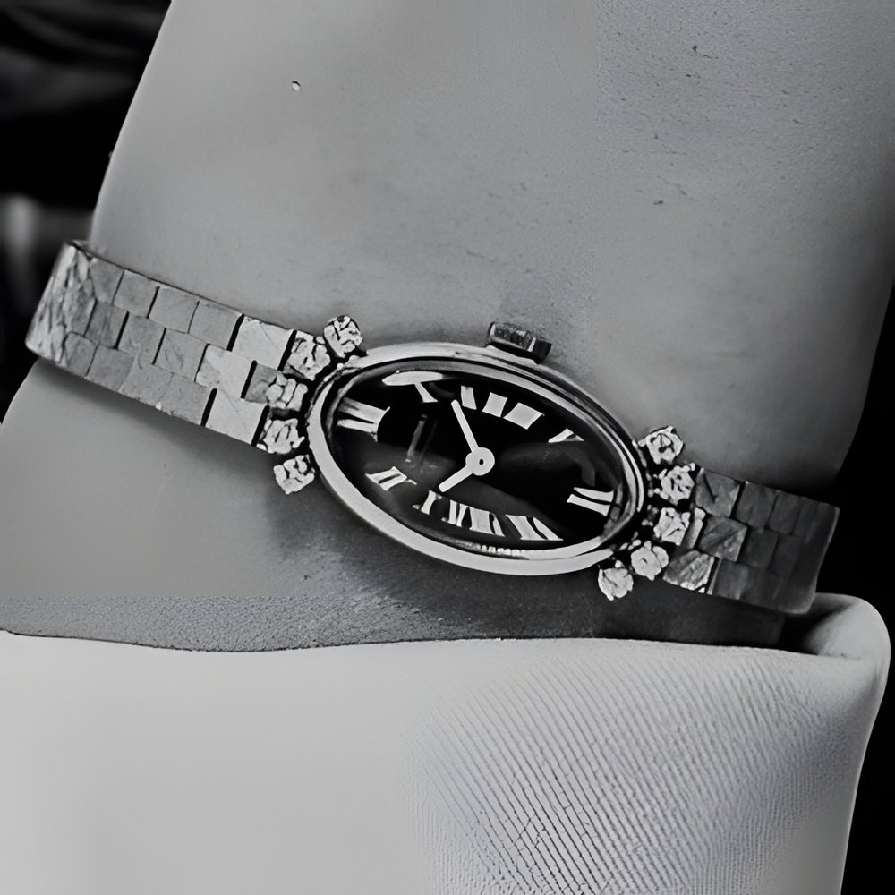 watch has a bassine case with a crown of 5 diamonds at either end.