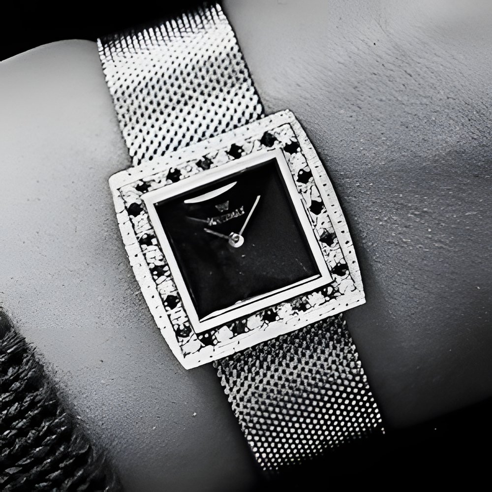 Love is blue and so is fashion : witness the dial of this jewellery watch. The case glows with brilliants and sapphires. Note the faintly rounded “tonneau” line sides. In grey gold. (PRECIMAX)