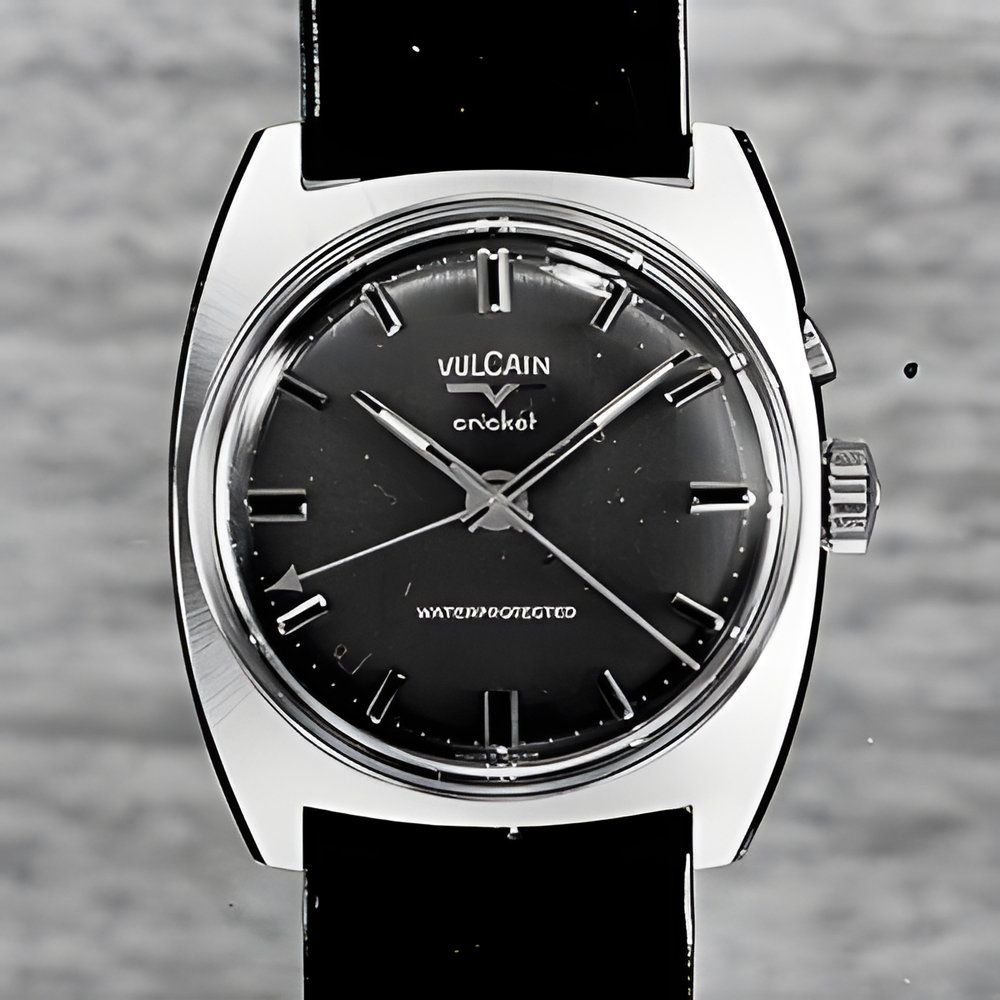 A new type of “Cricket” alarm-watch is presented by Vulcain in Basle. All-steel water-resistant case with incurved lines Slate-coloured dial with silvered onyx-inlaid hour markers and discreet minute-circle. (VULCAIN - “Cricket”)