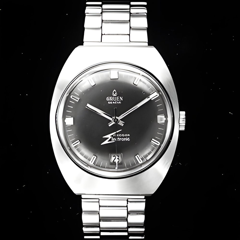 One of the many new electronic watches on display in Basel this year. It embodies a balance and hairspring system with transistorized circuit. The strongly cambered case with large bezel is available in steel or goldplate. Water-resistant to 5 atmospheres. White, gray, blue or champagne dials. (GRUEN - Electronic)