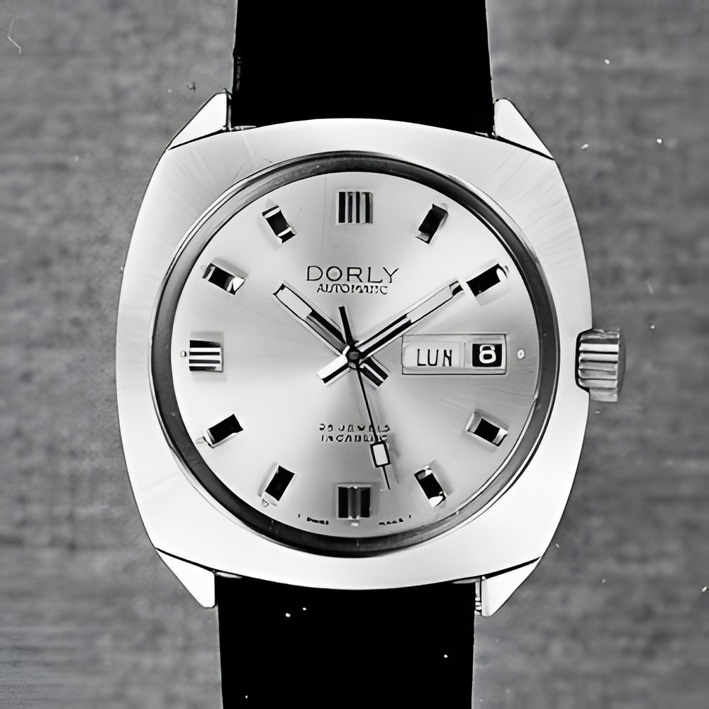 A perfect example of a modern man’s watch Large cushioned square case into which the bracelet flows smoothly. Dial face bearing min, strongly raised faceted hour markers. Automatic movement with day and date calendar. Water-resistant. Available in steel, Profectus or goldplate. This model can be supplied with an “Official chronometer” certificate. (DORLY)