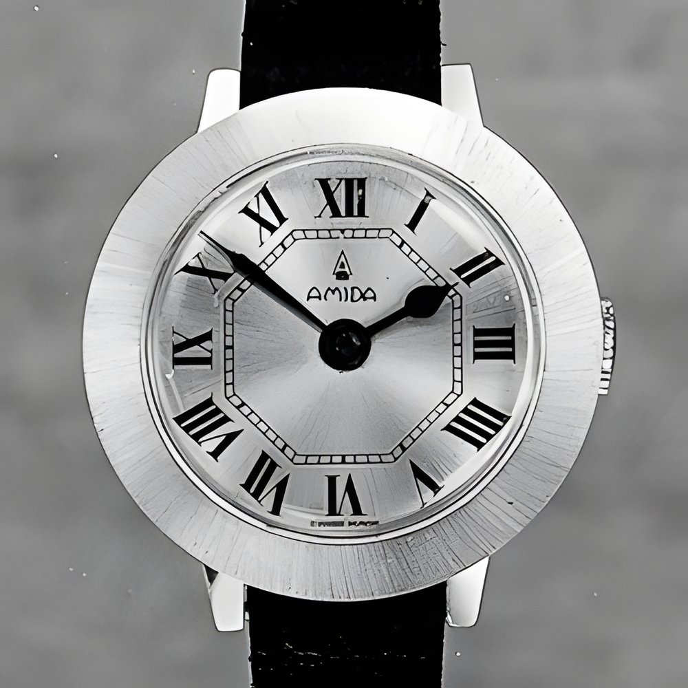 This ladies’ model, in stool back goidpiate , is striking for its wide bezel with Florentine decor and the- octagonal minute graduations on the silvered dial graced with Roman numerals A typical example of the “individu,-il” line in favour this year at Basle. (AMIDA).