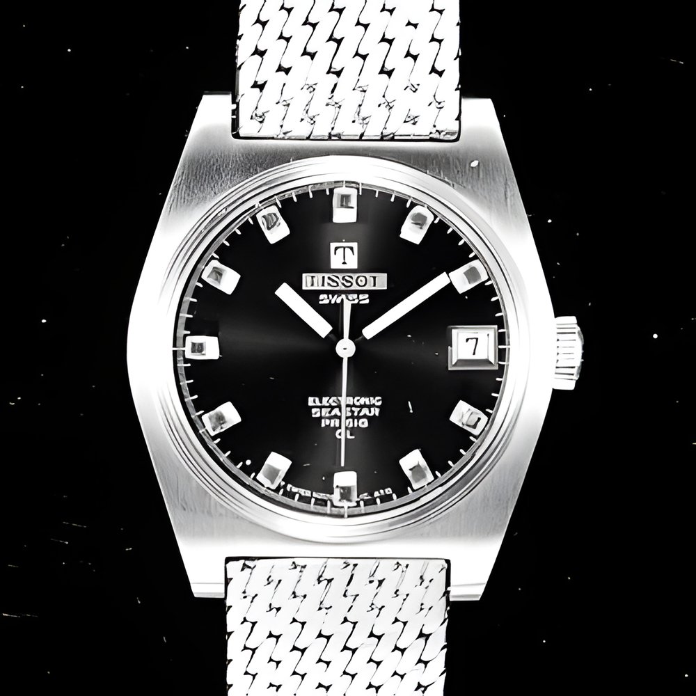 The new member of the,, Tissot P1 516 line : the electronic watch Endowed with the traditional characteristics of its group, it is rugged, has a water-resistant case and functional appearance. Equipped with the sprung-balance electronic movement with transistorized circuit, it is an all-steel model with blue dials raised silvered hour markers and is shown here with integrated steel bracelet. With calendar. (TISSOT “Seastar” PR 516)