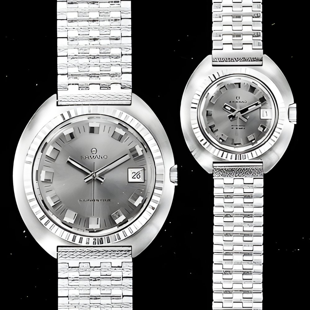 One for men, the other for ladies, differing only in diameter. A judicious idea since women now increasingly desire timepieces having features similar to those of men’ s models automatic winding, calendar, watertightness Ali-steel case with 20-micron goidpiated bezels (a goidpiate model with steel back is also available). Perfectly integrated metal bracelet or leather strap (ERMANO “Lunastar”)