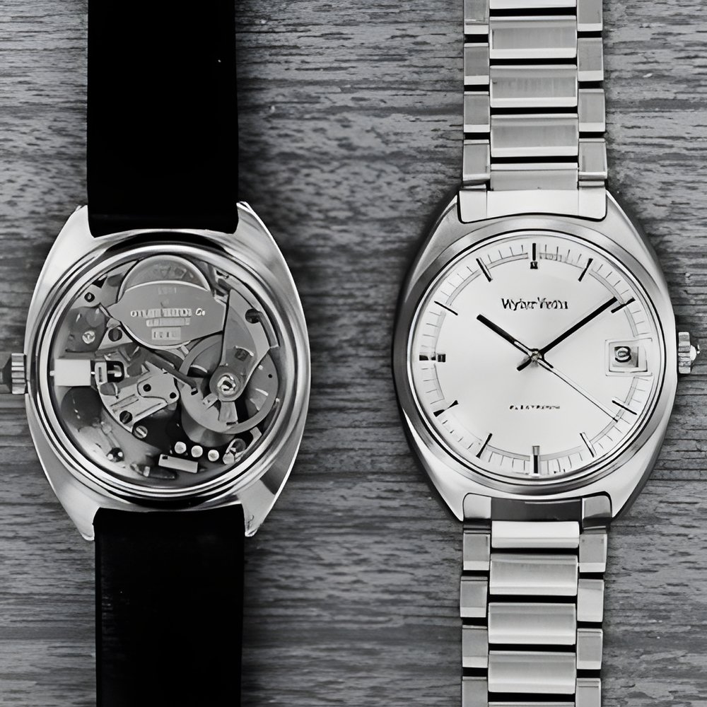 This model has a case with transparent plexiglass back. The working of the electronic movement with balance-wheel can thus be observed. All-steel or 13ct gold models also available. Monocoque (one piece) case. Highly legible “technical” minute-circuit on the dial, a characteristic feature of modern, accurate watches. With calendar (WYLER “Electronic”)