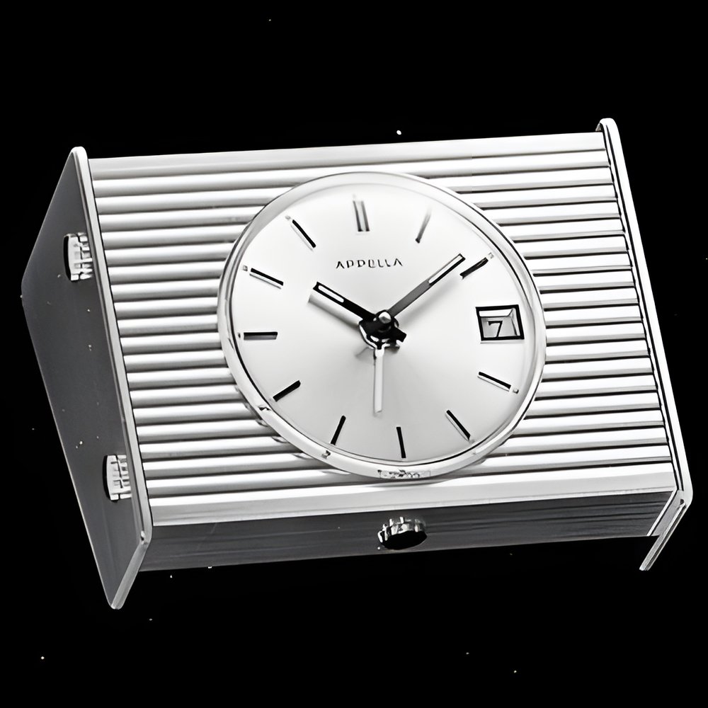 Small alarm-clock with silvered or gilt case. It incorporates a new “date corrector” system providing fast calendar setting. 7-jewel movement with shock-protection system and adjustable stud-holder. (APPELLA)