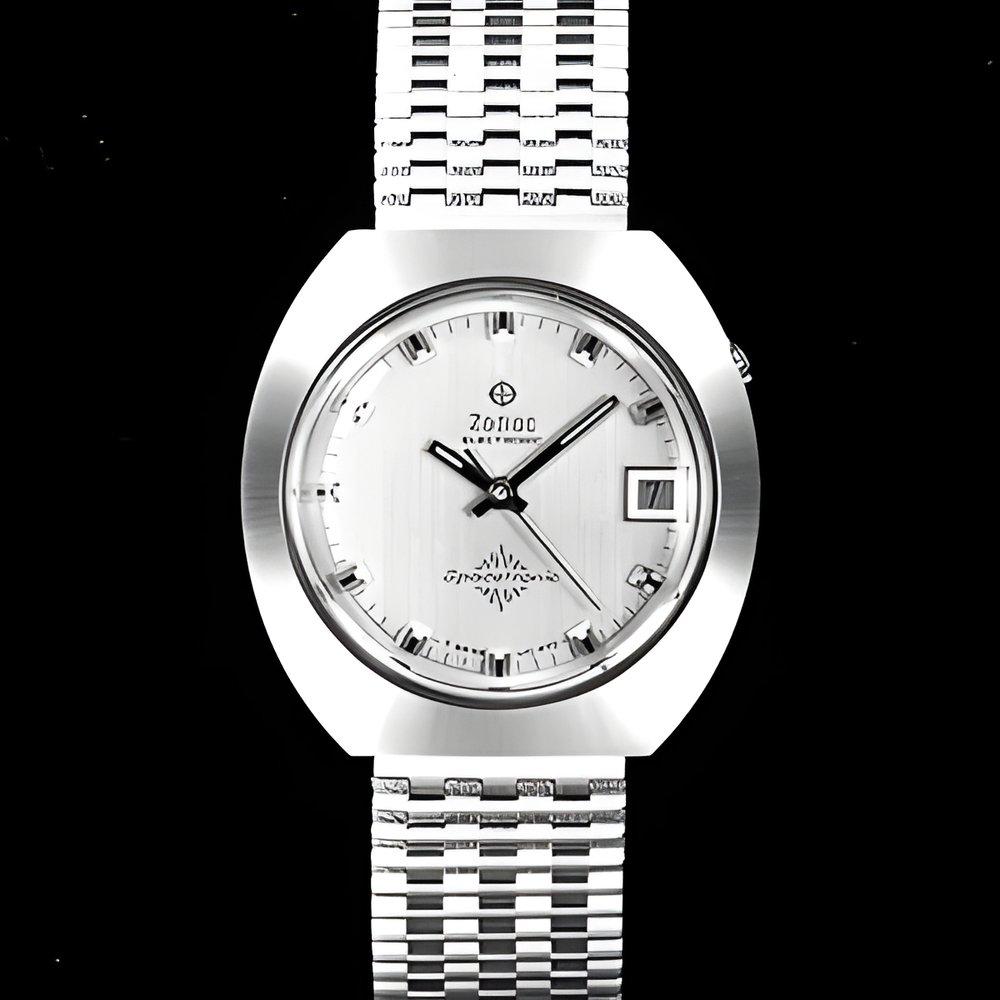 A new Zodiac 1actronic modol. “Tonneau” shape water-rosistant caso with strong masculine lines. Integrated braccJct and recessed winder. Onyx-inlaid applique hour-markers. With calendar. (ZODIAC “Spacetronic”)