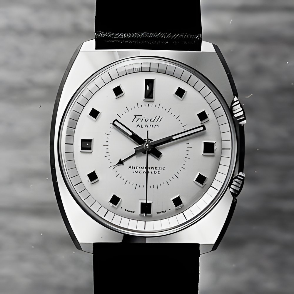 ?toIneal1t sides Water-resistant Proectus or goidpiate case, steel back Blue hour studs stand out against the silvered dial. Minute-circle inscribed on the flange. Note the 72-position inner division, designed for the alarm. It can he set precisely at every ten minutes of each hour. (FRIEDLI)