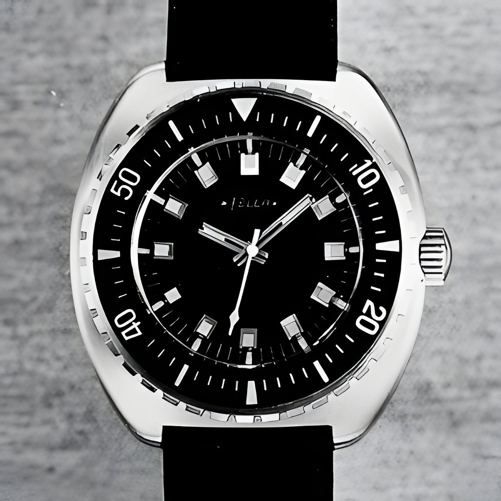 Diving watch with automatic movement. The calendar is excluded on purpose in order to increase dial legibility. Notches prevent the turning bezel from moving in the wrong direction, to prevent any risk of error in diving time calculations. Dark blue concave dial. Hour-markers are placed on the inclined sides and give the model a technical appearance. All-steel case water-resistant to 20 atmospheres. Scratchproof crystal. (FELCA-TITONI)