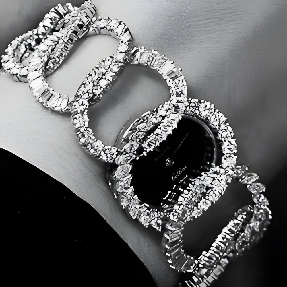Large links buth with diamonds This jewelled piece was designed by Rolex in homage to Benvenuto Cellini, the Italian goldsmith. It is composed of 314 diamonds (navette, baguette, brilliants) totalling nearly 20 carats. The frame is in i (ROLEX “Cellini collection”)