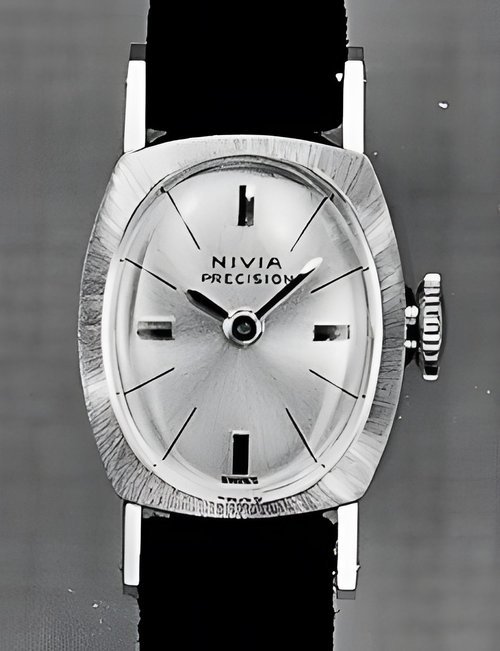 This model, goldplated or rhodium-plated, acquires a jewellery-watch character thanks to its classically simple lines The bracelet flows elegantly into the case and the dial has black oxidized raised hour markers against a guilloché background. (NIVIA)