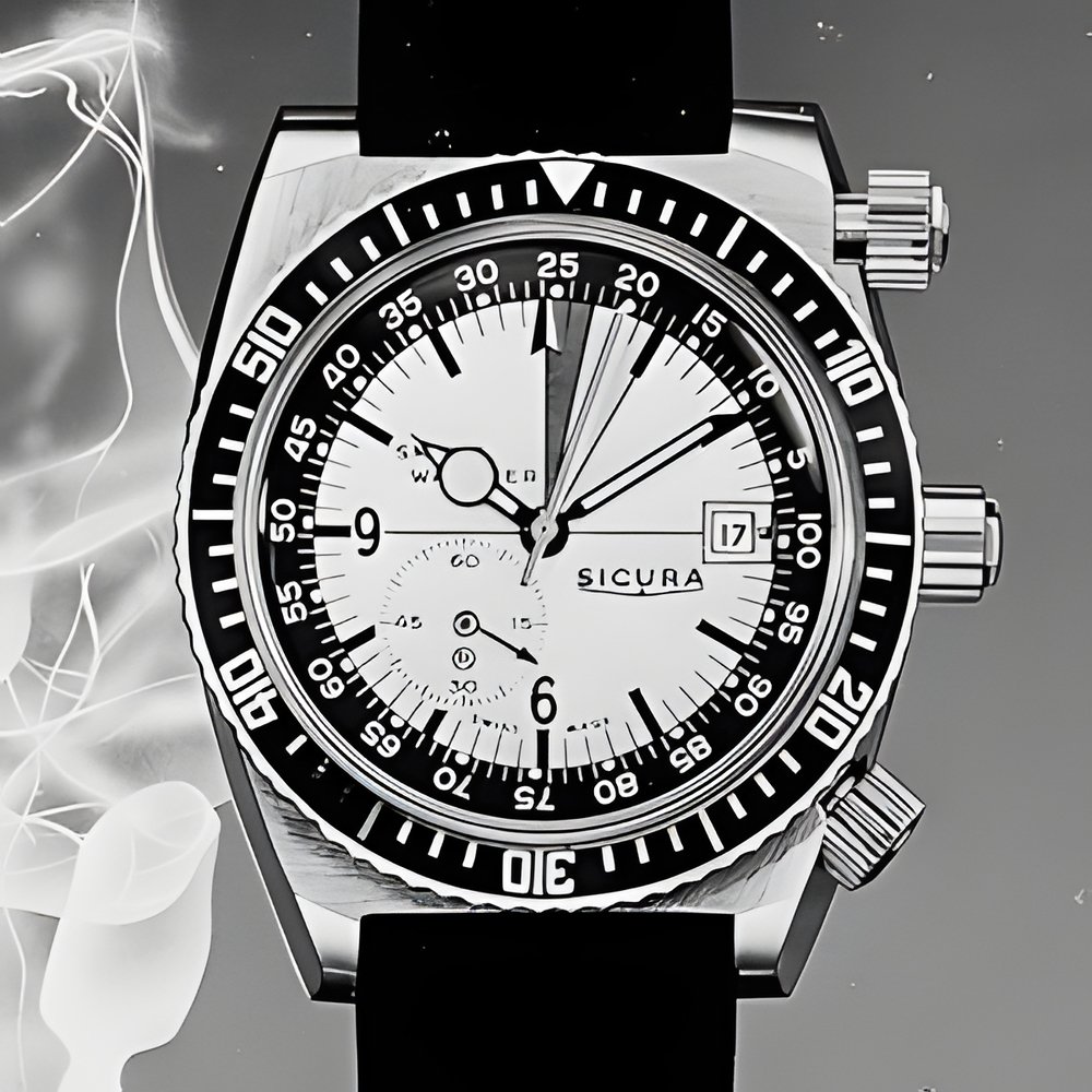 This Swiss watch was created specially for smokers, at the request of Mr. Richard E. Rudolf, the American Professor, well known for his research in the harmfulness of tobacco. Effectively, he thinks that intoxication stems not only from the number of cigarettes smoked, but also from consumption frequency. This watch has an independent minute counter that the smoker sets in motion when he puts out a cigarette. He can then verify the time that elapses before lighting another - and avoid doing so if the hand is still in the coloured areas of the dial, corresponding to life danger periods. Furthermore, a recorder counts, by simply pressing the button, the number of cigarettes smoked daily. A watch made in an inexpensive version, and hence within everybody’s reach, by the firm Sicura at Grenchen. (SICURA - Smoke Watcher)