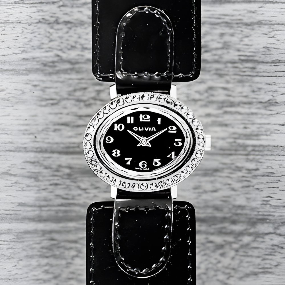 A most fashionable model for ladies. Oval case set with imitation jewels. The dial is made in different colours, Breguet-numerals. Note the very broad, absolutely ’in’, bracelet. (Viator S.A. - OLIVIA)